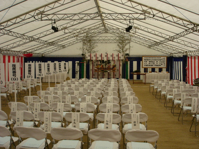■建設工事に伴う、起工式、地鎮祭、上棟式、竣工式、落成式等の企画、運営、会場設営 ■各種パーティー会場の設営 ■大空間での式典会場をご提供可能な式典トラステント(4間間口、6間間口、8間間口) ■アルミトラス、ステージ、各種テントによるイベント会場の施工等
